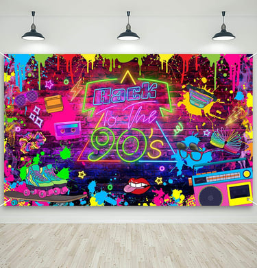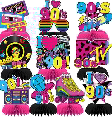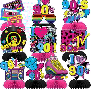This 10-piece set of double-sided 90s decorations creates a fun, retro atmosphere and eye-catching visuals for your party.