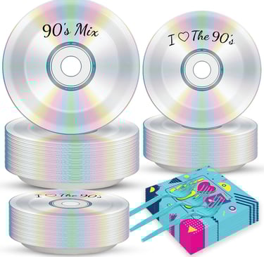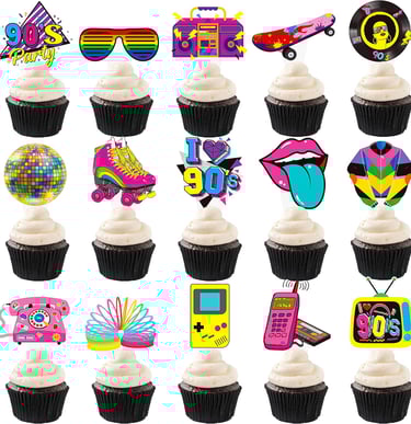 This set includes 48 unique 90s-themed cake toppers featuring fun retro icons like disco balls, roller skates, and vintage consoles.