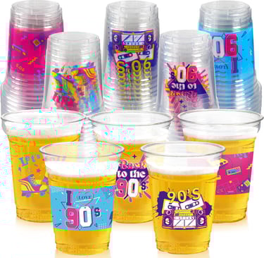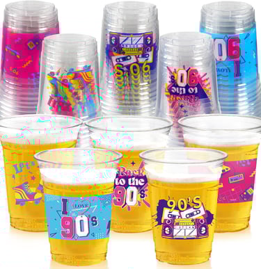 These 16oz plastic cups feature five bold, retro 90s designs, adding a fun and nostalgic touch to any 90s-themed party.