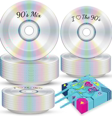 This 90s party set includes 50 dinner plates, 50 dessert plates, and 50 napkins, adding a fun and festive retro vibe to any celebration.