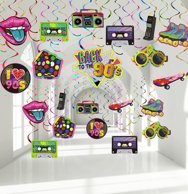 This 30-piece set of 90s-themed foil swirl decorations adds color and movement, creating a lively retro party atmosphere.