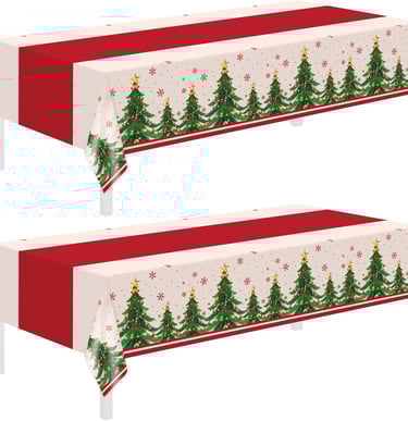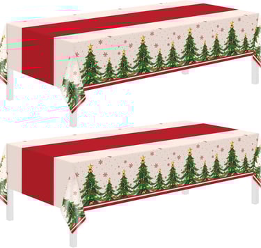 Brighten your holiday table with these disposable Christmas tablecloths, featuring vibrant prints of snowflakes, trees, ornaments, and jingle bells!