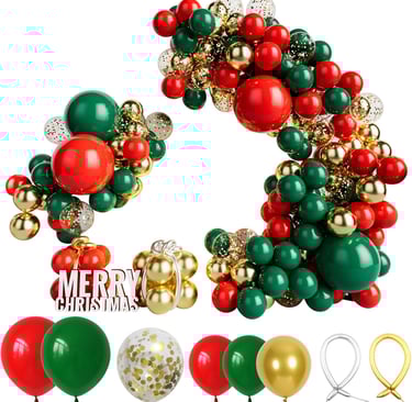 This complete balloon kit includes 144 vibrant balloons in red, green, and gold, plus ribbon, tape, and glue dots—everything you need to create a stunning holiday balloon arch!