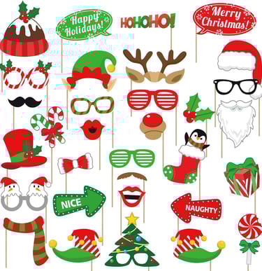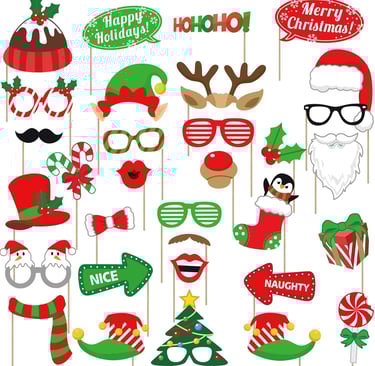 Capture festive memories with this 32-piece Christmas photo booth prop set—featuring hats, reindeer, trees, and more for endless holiday fun!