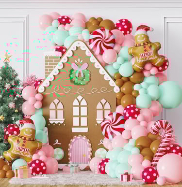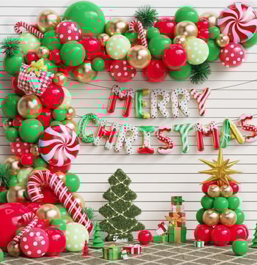Create a stunning holiday display with this 157-piece Christmas balloon set featuring red, green, and gold balloons, candy canes, lollipops, stars, and festive accessories!