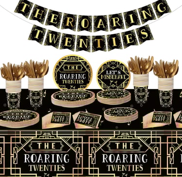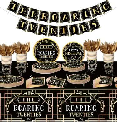 This complete 1920s party set serves 24 guests with themed tableware, utensils, and decorations for a stylish Roaring Twenties celebration.
