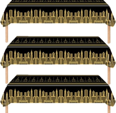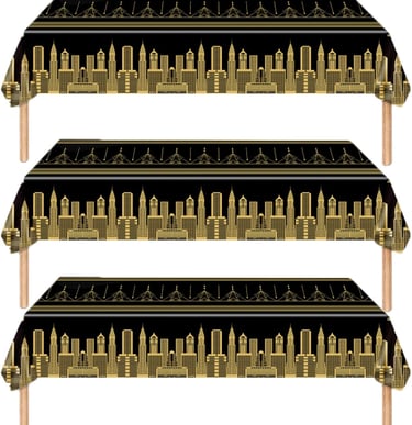 These black and gold patterned tablecloths add a stylish Roaring 20s vibe and double as table covers or photo backdrops for any celebration.