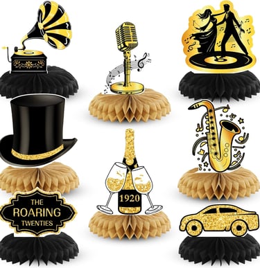 This set of 8 retro 1920s-themed decorative props adds variety and style to any Roaring Twenties party.