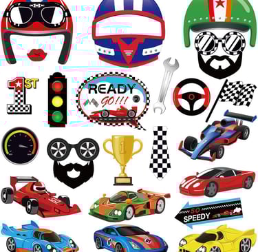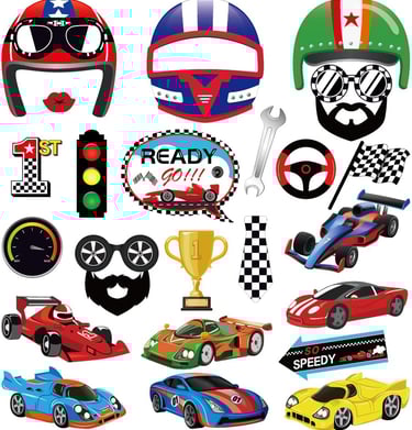 Rev up the fun with this Let’s Go Racing party prop set—featuring hats, glasses, masks, bows, and car props, perfect for photos and festive décor!
