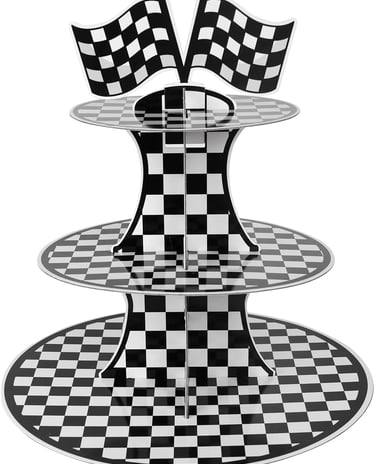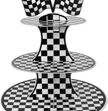 Show off treats in style with this race car-themed cupcake stand—featuring classic black-and-white checkered designs, perfect for car lovers’ birthday parties!
