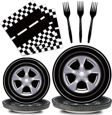 Host the ultimate race car party with this complete tableware set for 24—includes dinner plates, dessert plates, napkins, and forks, all themed for car-loving guests!