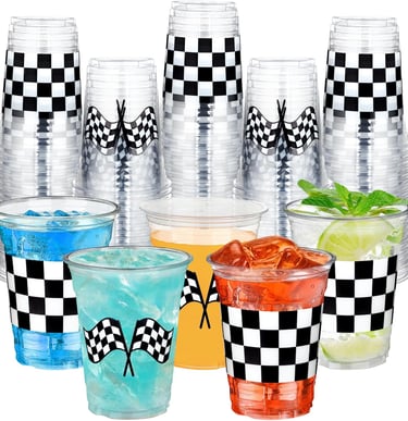Fuel the fun with this set of 50 checkered racing party cups—25 of each pattern, perfect for a thrilling race car-themed celebration!