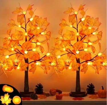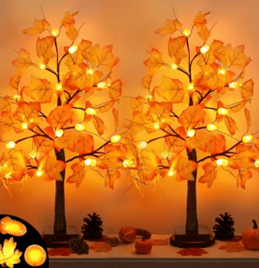 This 2-pack of 24-inch lighted maple trees, featuring warm LED lights, pumpkins, acorns, and bendable branches, offers safe, battery-powered, and reusable autumn décor perfect for creating a cozy Thanksgiving or fall atmosphere anywhere.