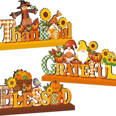 This 3-piece wooden pumpkin table decor set features durable, vividly printed designs perfect for adding a warm fall and Thanksgiving touch to any space.