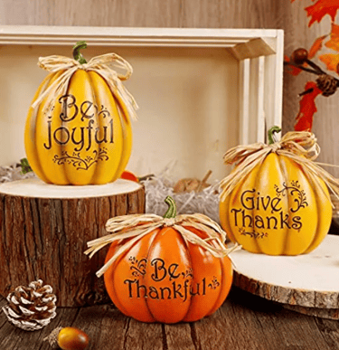 This set includes three hand-painted resin pumpkins with thankful messages—perfect for fall, Thanksgiving, or home decor.