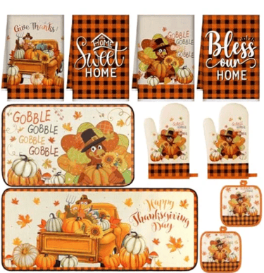 This 10pcs fall kitchen set includes towels, placemats, pot holders, and oven mitts with pumpkin and maple designs—durable, absorbent, and perfect for cooking or gifting.