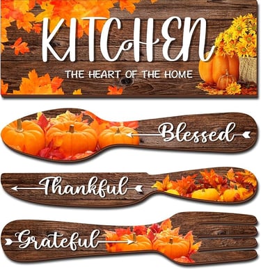 This 4-piece fall kitchen wall decor set, made of durable wood with bright, clear prints, includes block, spoon, knife, and fork designs—easy to hang and perfect for farmhouse, rustic, or modern kitchens.