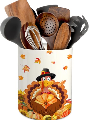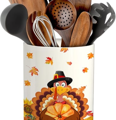 This Thanksgiving utensil holder features turkey, pumpkin, and maple leaf designs, made of durable ceramic, and serves as both a festive kitchen decoration and practical organizer.