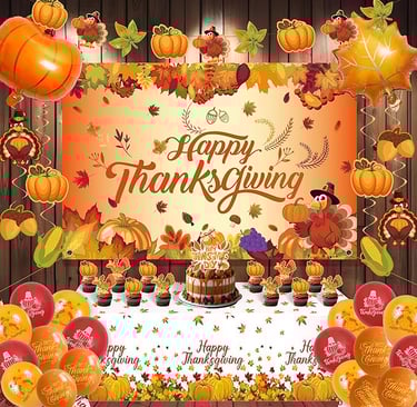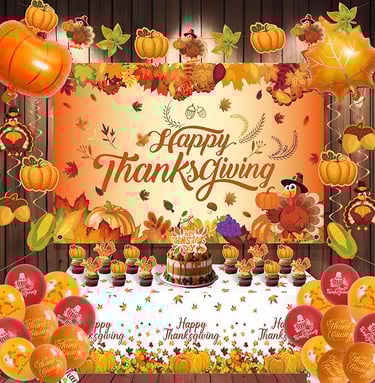 This 45+ piece Thanksgiving set includes a backdrop, tablecloth, balloons, banner, and toppers perfect for easy, festive fall decorating.