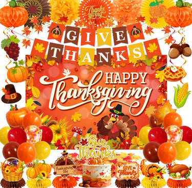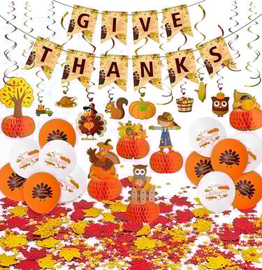This 34-piece Thanksgiving decor set includes a banner, balloons, honeycomb pieces, confetti, and foil swirls, making it easy to add colorful, festive autumn charm to any room or celebration.