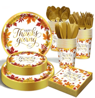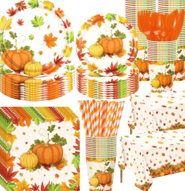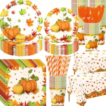 This fall party set includes plates, cups, napkins, utensils, straws, and tablecloths with pumpkin and leaf designs. Everything is sturdy, disposable, and easy to clean up perfect for Thanksgiving, harvest parties, or any fall event.