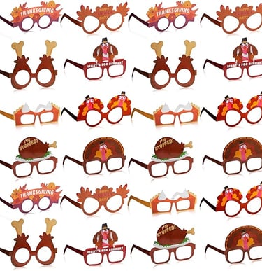 This 24-pack of durable paper turkey eyeglasses comes in 8 fun designs, perfect for all ages to enjoy at Thanksgiving parties, costumes, or photo booths.