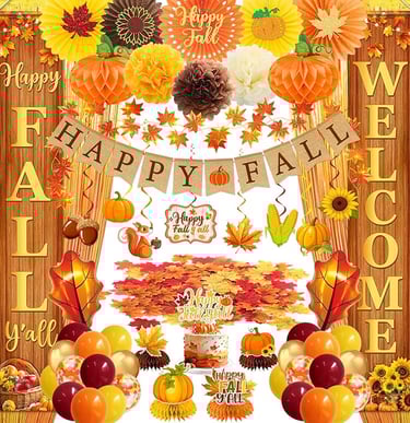 This fall party set includes banners, balloons, garlands, and centerpieces to easily create a festive autumn atmosphere.