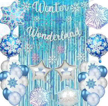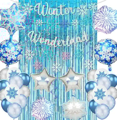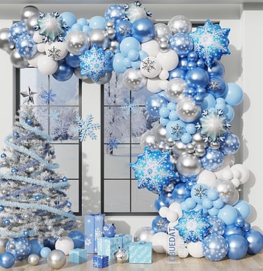 Create a magical Ice Snow party with this 140-piece decoration kit—featuring blue, white, and metallic balloons, snowflake foils, a 16ft balloon arch, and all the accessories you need!