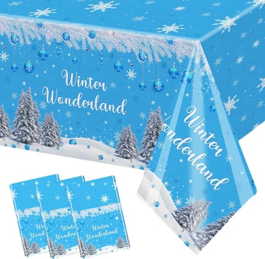 Deck your tables with this 3-pack Winter Wonderland tablecloth set—featuring snowy blue designs and pine tree accents, perfect for baby showers or winter birthday parties!