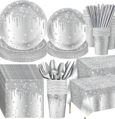 Host a stylish celebration with this silver party set, including 100 plates, 100 napkins, 50 cups, 50 sets of utensils, 50 straws, and 2 large tablecloths—everything you need for a complete party setup!