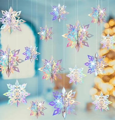 Add sparkle to your celebrations with these iridescent hanging paper snowflakes—perfect for Christmas, New Year, winter wonderland parties, and festive home décor!